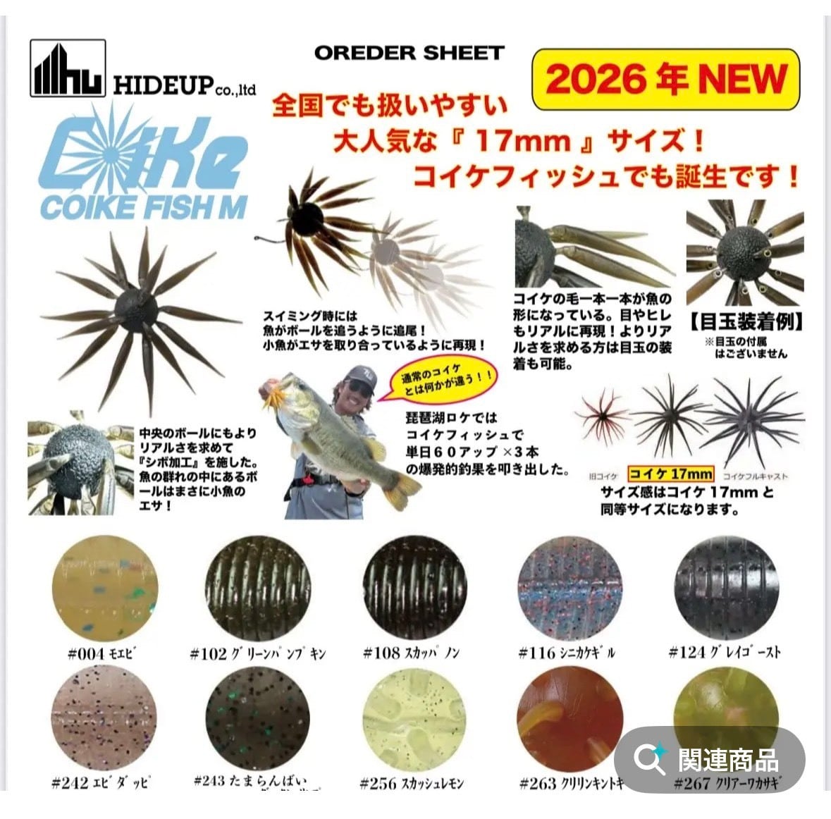 ※発送までに期間がありますので【代金後払い】での支払いを選ばれますとBASEのシステム上発送までに時間がかかると自動キャンセルされますので【代金後払い】のお支払いは選ばないようにお願いします。 また他の予約商品とは入荷時期が違うので同じカートでは購入できませんので、予約商品をご購入の際はカートは分けてご購入下さい。 同カートで違う予約商品を混ぜてご購入の場合自動キャンセルとなりますのでご注意ください。 こちらの商品は予約商品になりますのでキャンセルはできませんのでご注意下さい。 予約数が入荷量をこえてしまうとお渡しができませんので、 ご注文決済順からお渡しさせていただき予約数オーバーの場合、 全額返金とさせていただきます。 決済後、仮発送通知が送られましたらご予約完了となり、 納期はあくまでも入荷予定となりますので入荷が前後する事もありますのでご了承下さい。 ご予約商品が届き次第の発送となりますので宜しくお願い致します。 店頭受け取り希望の場合は決済画面下の備考欄に、 店頭受け取り希望と書いていただけましたら入荷次第ご連絡させていただき、 受け渡しの際に送料を返金させていただきます。 ・コイケフィッシュM ・入り数 1個 ・素材エラストマー 2026年4月以降の発売予定となります。 サイズ感はコイケ17㎜と同サイズになります。 202582990