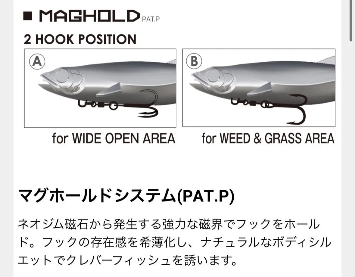 マグドラフトはスロー、ファストどちらでも、安定したリトリーブが可能なスイムベイト。アクションはウォブンロールを基本に、一般的なスイムベイトよりもややハイピッチに動きます。また、ベリー部のスリットとメガバス独自のマグホールドシステムでフックをボディへ密着。フックの存在感をカモフラージュし、魚への違和感を解消しています。